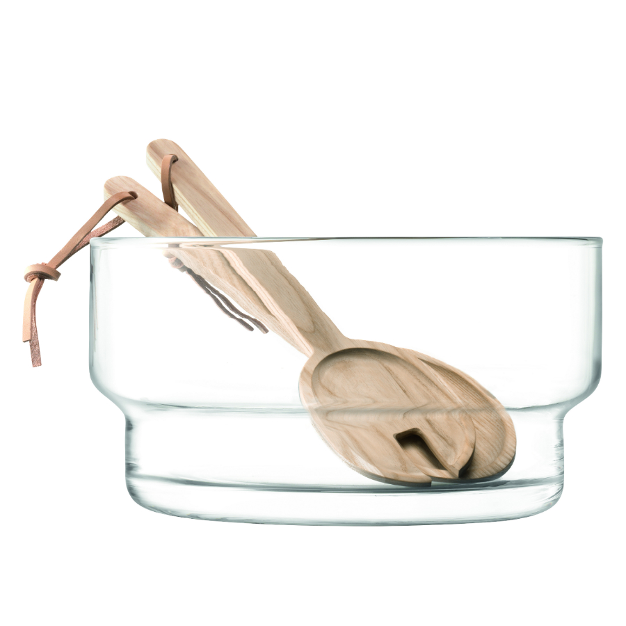 Глубокое блюдо Utility с деревянными приборами станет оригинальным украшением повседневного и праздничного стола. Посуда из выдувного стекла подходит для сервировки овощных и фруктовых салатов.